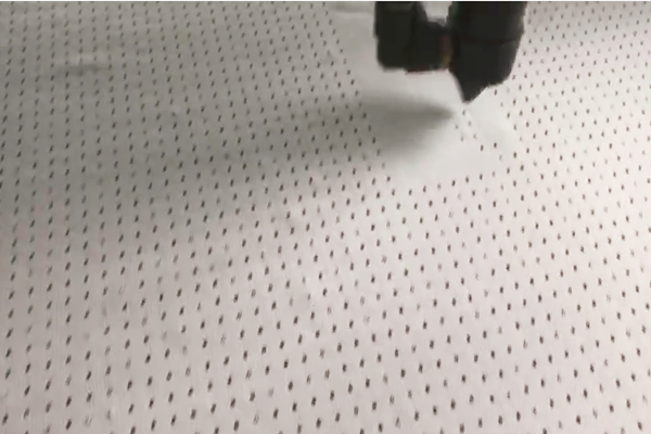 其實(shí)簡單來說鐳射就是激光,激光加工技術(shù)是利用激光束與物質(zhì)相互作用的特性對材料進(jìn)行切割、表面處理、打孔、微加工等,識(shí)別物體等的一門技術(shù)。而且呢鐳射光束具有高亮度、高方向性、高單色性和高相干性四大特性,所以就給鐳射加工帶來一些其它加工方法所不具備的特性。又由于它是無接觸加工,對材料無直接沖擊,沒有機(jī)械變形;在鐳射加工過程中也無“刀具”磨損,無“切削力”,那您定制的沖鋒衣就能保持切割表面光潔美觀了;其次鐳射加工過程中,鐳射光束能量密度高,加工速度快,并且是局部加工,對非鐳射照射部位沒有影響或影響力極小。但是有的沖鋒衣的制作用鐳射機(jī)穿孔一個(gè)工序就要花上一個(gè)半多小時(shí),可以看看下面的圖片,而且我們?yōu)榱吮WC沖鋒衣的質(zhì)量以免出錯(cuò)還要專門派人看著,所以說一件沖鋒衣的制作工藝不簡單!