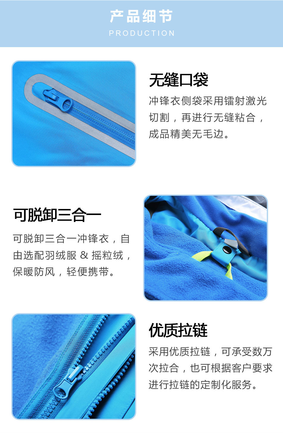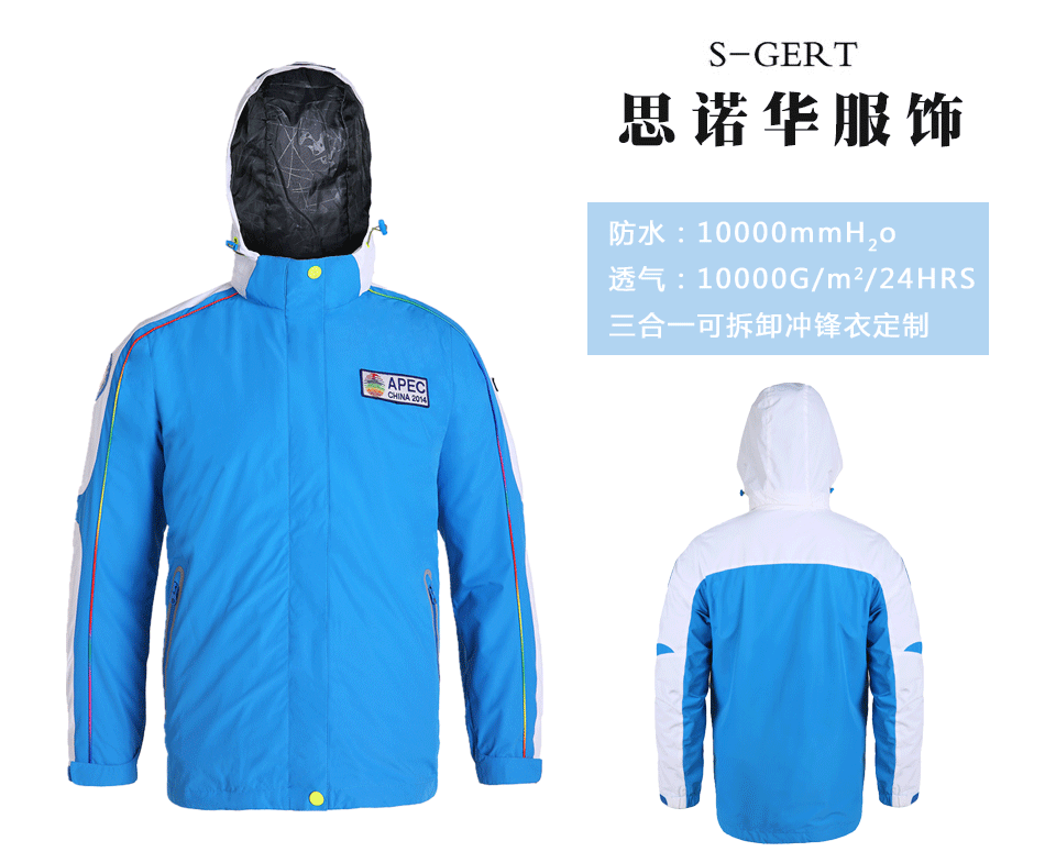 可脫卸沖鋒衣:可脫卸沖鋒衣定制,自由選配羽絨服&搖粒絨,保暖防風,輕便攜帶。